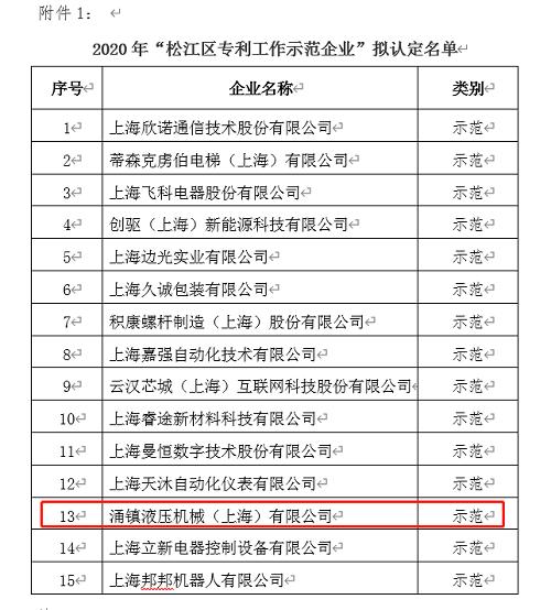 2020年涌鎮(zhèn)液壓成功入選“松江區(qū)專利示范企業(yè)”行列,并獲得立項(xiàng)。