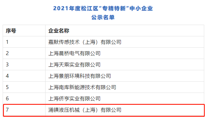 《松江區(qū)“專精特新”中小企業(yè)發(fā)展專項支持實施細(xì)則(2020年版)》(滬松經(jīng)〔2020〕165號),區(qū)經(jīng)委組織開展了2021年度松江區(qū)“專精特新”中小企業(yè)申報和復(fù)核工作。涌鎮(zhèn)液壓充分發(fā)揮自身優(yōu)勢,堅持獨立自主的研發(fā)與創(chuàng)新設(shè)計,憑借高效的產(chǎn)品創(chuàng)新能力和廣泛的市場認(rèn)可度,成功申報并獲得上海市松江區(qū)“專精特新”的稱號。